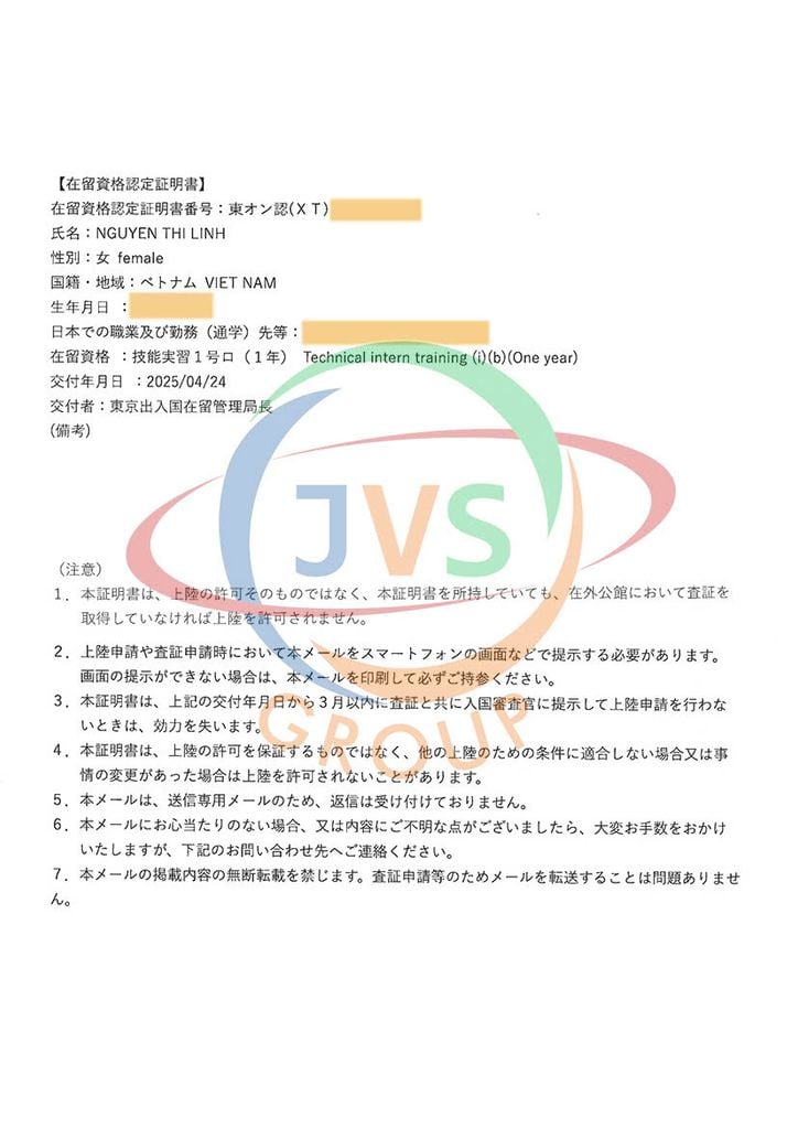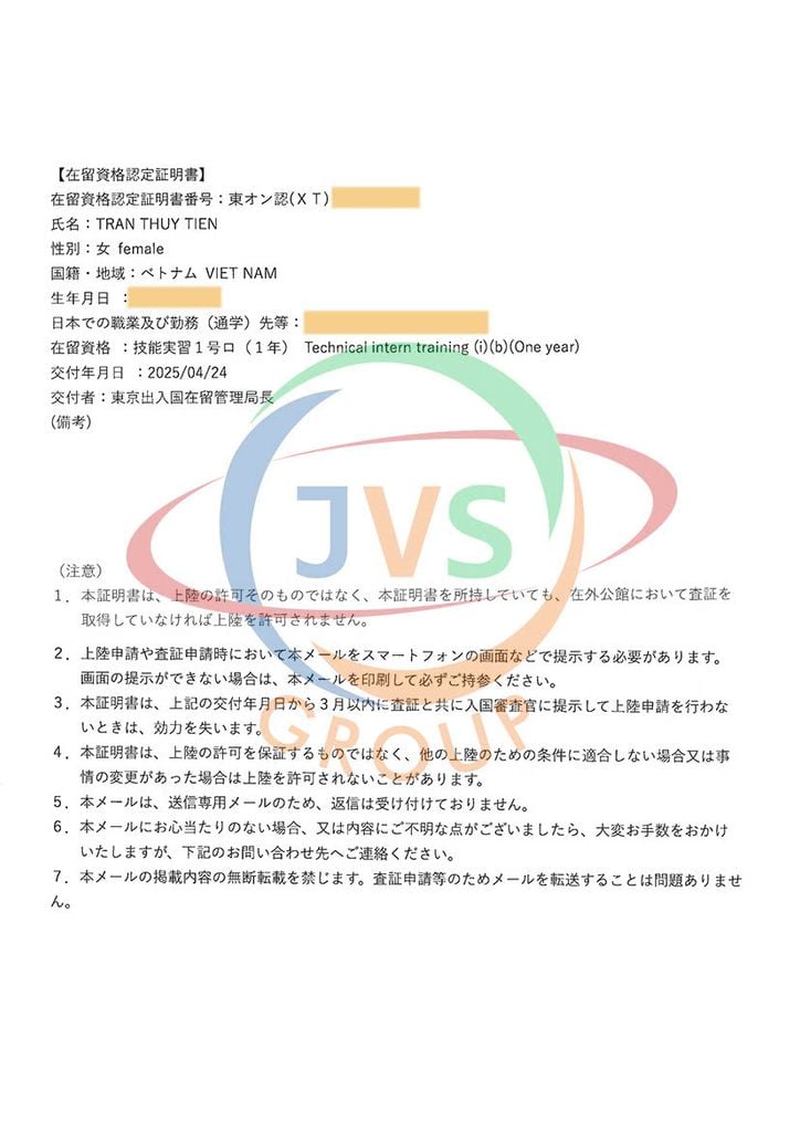 2025年11月5日 弊社1名の実習生【介護:女性1名】の在留資格認定証明書が下りました。おめでとうございます!